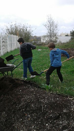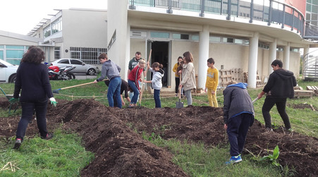 Printemps 2018 : Les élèves donnent forme à la pelle et au rateau à la forme en S de Sévigné. Le SYDETOM66, partenaire du projet, nous a livré gratuitement 4 tonnes de BVC (Broyat Vert Criblé et 4 tonnes de compost. Ce S doit accueillir différentes plantations et servir de protection contre la tramontane.