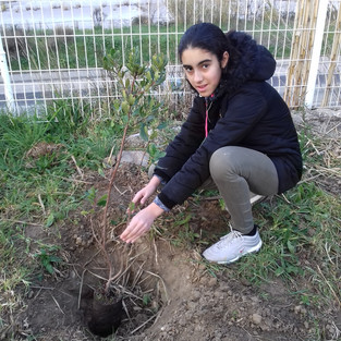 Les 603 plantent les arbustes que nous a donnés le Conseil Départemental : tilleul argenté, olivier, laurier sauce, arbousier, romarin, chêne vert...pour faire une jolie haie qui protégera du vent et agrémentera le jardin.