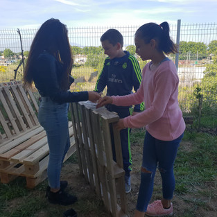 Sacha, Hugo, Cindy, Evana et Djellali dans la classe des ULIS de Mme Etcheberry ont fabriqué un mobilier pour le jardin afin de se détendre en s'émerveillant des efforts soutenus qui ont engendré tant de beauté... Une phrase pleine de promesses personnalise le fauteuil en relation directe avec les ateliers philo menés par leur professeur : " toujours croire en ses rêves, ne jamais baisser les bras.."